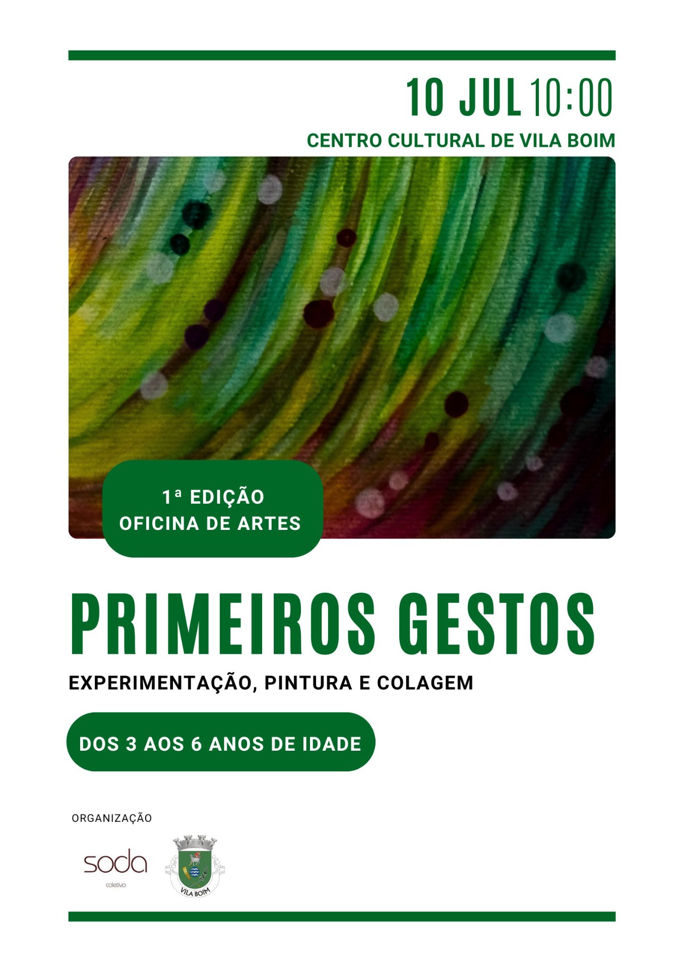 O Coletivo SODA irá realizar a sua 1ª Oficina de Artes no dia 10 de Julho de 2025, pelas 10h00 no Centro Cultural de Vila Boim. A oficina será um momento de "Primeiros Gestos" de experimentação da pintura e colagem, para as crianças dos 3 aos 6 anos de idade. A sessão será coordenada por Daniela Silva com o apoio da Junta de Freguesia de Vila Boim. + info